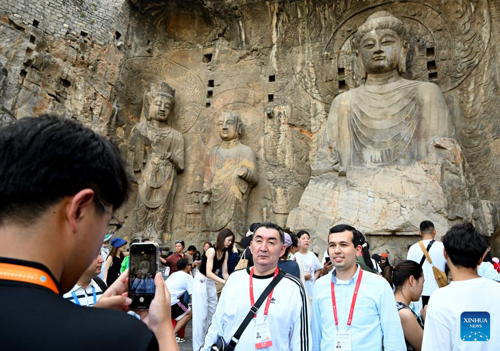 Participants of the Shanghai Cooperation Organization (SCO) Media and Think Tank Summit visit the Longmen Grottoes scenic spot in Luoyang City, central China's Henan Province, July 26, 2025. The SCO Media and Think Tank Summit is held in Zhengzhou from July 23 to 27. Participants are invited to visit various locations in Henan during the summit. (Xinhua/Hao Yuan)