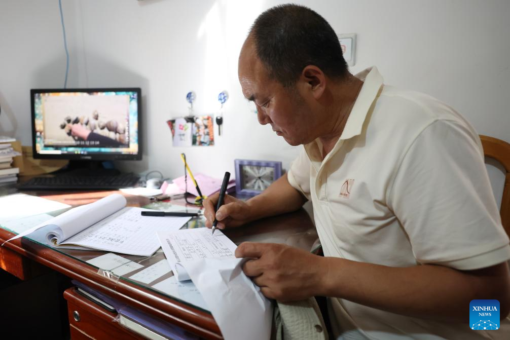 Mu Changyou, a cultural relics restorer of Maiji Mountain Grottoes art institute, fills out a logbook for restoration work at a cave of the Grottoes in Tianshui City, northwest China's Gansu Province on July 16, 2025. (Xinhua/Chen Bin)