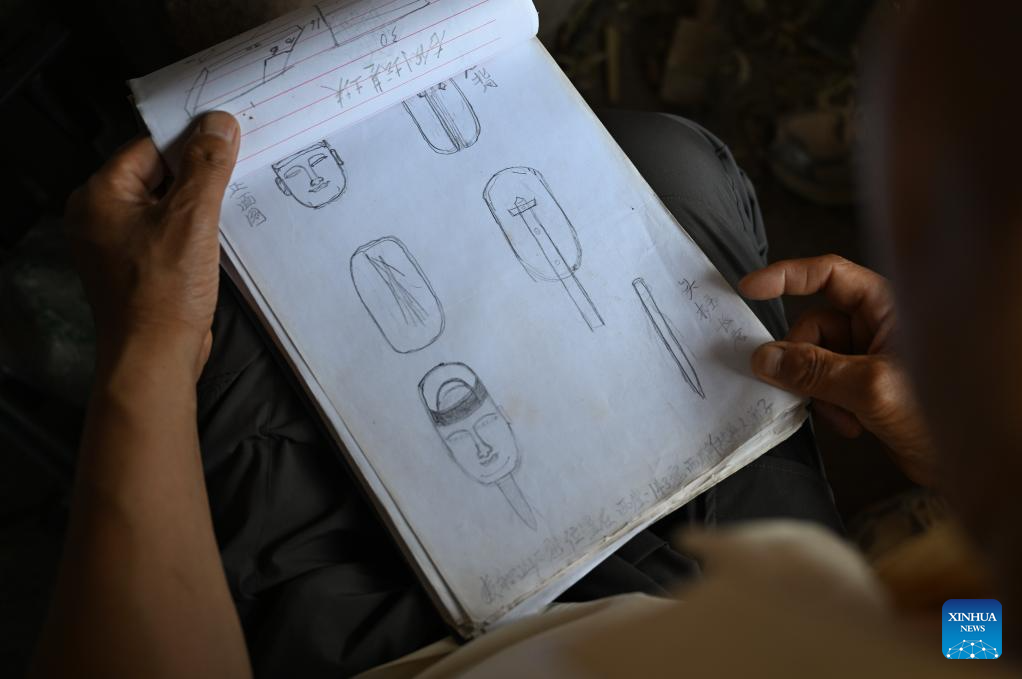 Mu Changyou, a cultural relics restorer of Maiji Mountain Grottoes art institute, browses through his restoration draft at a cave of the Grottoes in Tianshui City, northwest China's Gansu Province on July 16, 2025. (Xinhua/Cai Xiangxin)