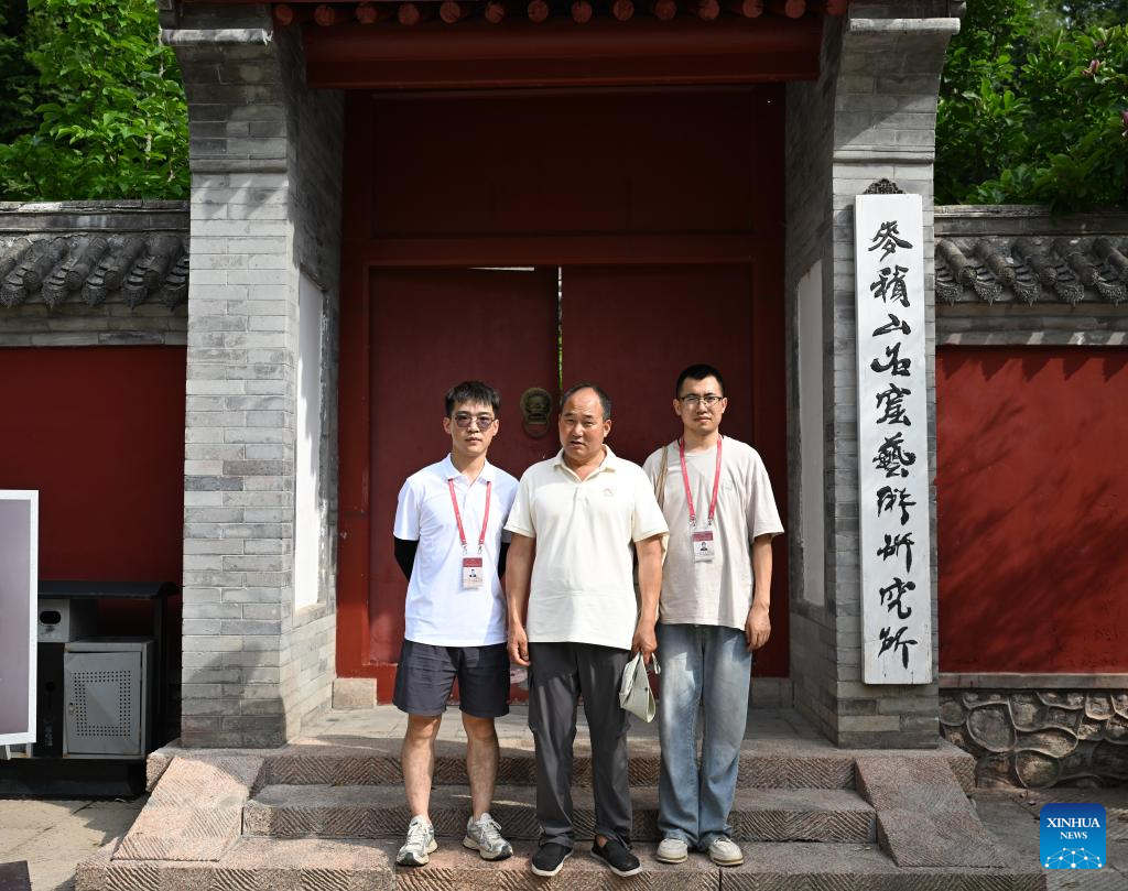Mu Changyou (C) poses for photos with his apprentices after a day's work in front of Maiji Mountain Grottoes art institute, in Tianshui City, northwest China's Gansu Province on July 16, 2025. (Xinhua/Cai Xiangxin)