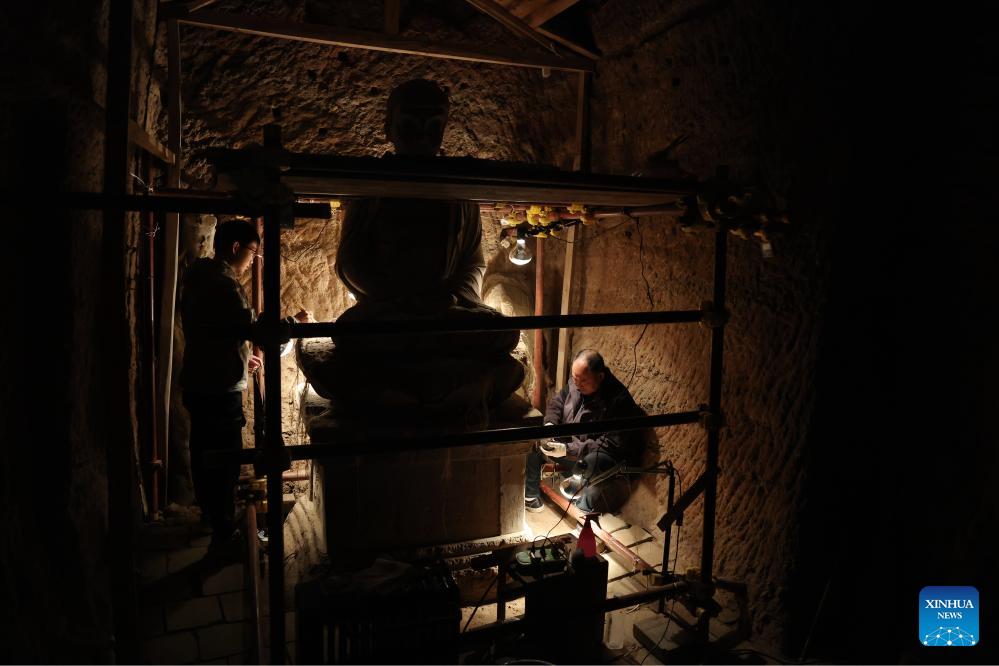 Mu Changyou, a cultural relics restorer of Maiji Mountain Grottoes art institute, performs restoration work of a statue at a cave of the Grottoes in Tianshui City, northwest China's Gansu Province on Dec. 25, 2019. Mu Changyou, 59, has worked on relics restoration for four decades at Maiji Mountain Grottoes, one of the four most famous grottoes in China. Starting as an apprentice, Mu had spent more than 10 years doing chores like cleaning caves, arranging tools, mixing mud and twisting hemp ropes etc. Thanks to constant interactions with and guidance by weathered masters in this walk of life, along with diligence in reading of professional books and hands-on practice, Mu eventually turned himself from a farmer to a senior cultural relics restorer.