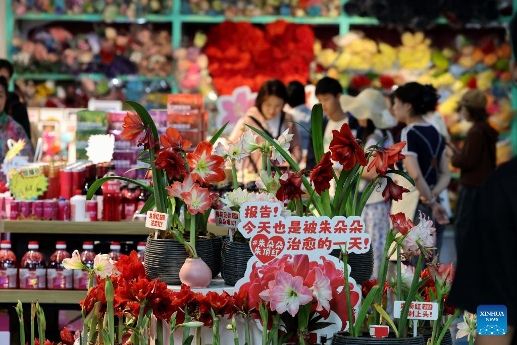 Florists make creative floral products at the Dounan Flower Market in Kunming, southwest China's Yunnan Province, July 28, 2025. As one of Asia's largest fresh-cut flower trading markets, the Dounan Flower Market attracts tourists from China and abroad.