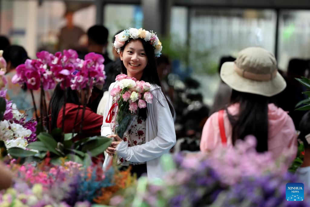 A tourist poses for photos with flowers at the Dounan Flower Market in Kunming, southwest China's Yunnan Province, July 28, 2025. As one of Asia's largest fresh-cut flower trading markets, the Dounan Flower Market attracts tourists from China and abroad.