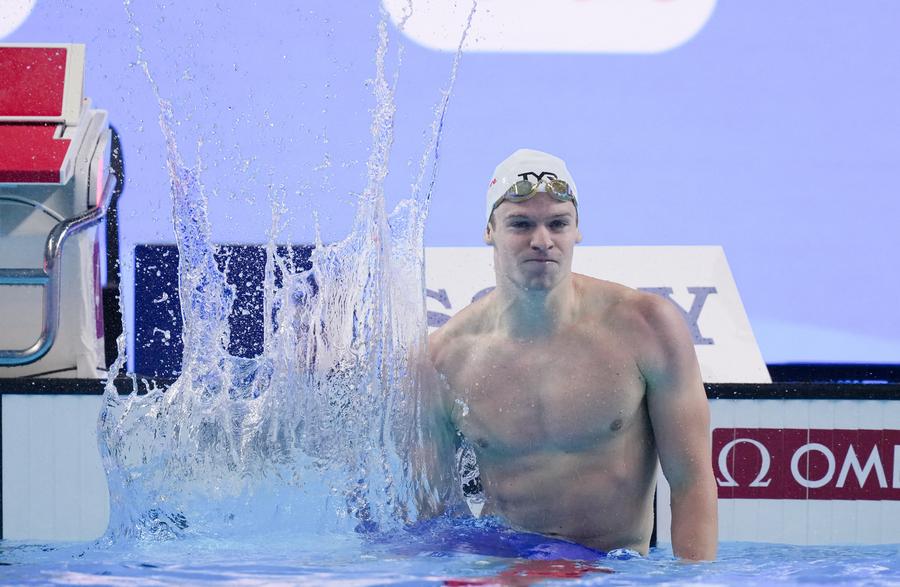Leon Marchand of France celebrates after the men's 200m individual medley semifinal at the World Aquatics Championships in Singapore, on July 30, 2025. (Xinhua/Wu Zhizun)