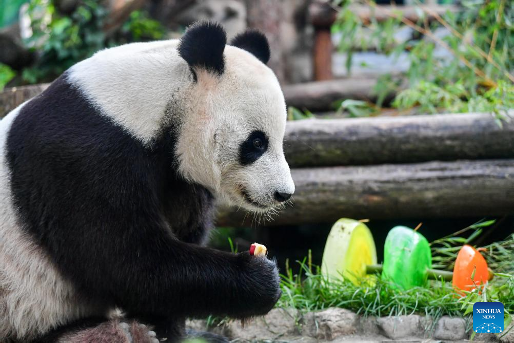 Giant panda Ru Yi eats food at the Moscow Zoo in Moscow, Russia on July 31, 2025. The Moscow Zoo held an event to celebrate giant panda Ru Yi's birthday on Thursday. (Xinhua/Zhang Chaoqun)