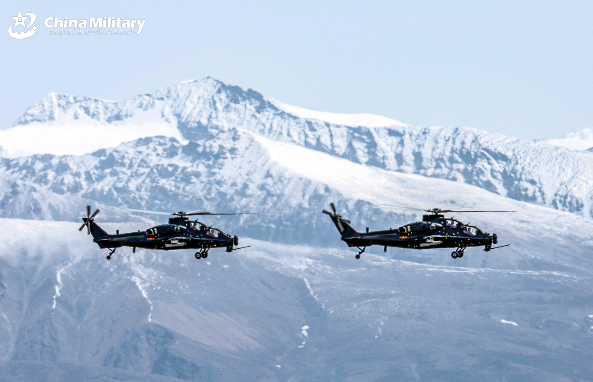 WZ-10 attack helicopters attached to a brigade under the Chinese PLA Xizang Military Command fly in formation during a flight training exercise on July 3, 2025. (eng.chinamil.com.cn/Photo by Hu Qiwu)
