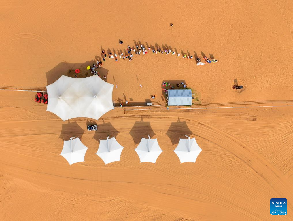An aerial drone photo taken on Aug. 1, 2025 shows people riding camels at a desert scenic area in Dalad Banner of Erdos City, north China's Inner Mongolia Autonomous Region. Kubuqi desert in Erdos City has entered its peak tourist season in midsummer, attracting numerous tourists from around the country to visit. (Xinhua/Lian Zhen)