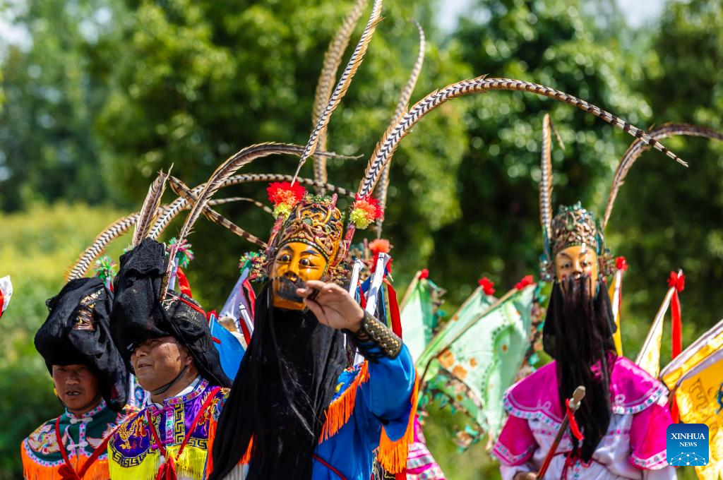 Actors take part in a Dixi opera parade at the Miaoling Tunpu scenic area in Xixiu District of Anshun City, southwest China's Guizhou Province, Aug. 2, 2025. Anshun Dixi Opera is an important part of Tunpu culture dating back to the Ming Dynasty (1368-1644). The opera has been listed as a national intangible cultural heritage item in 2006. (Photo by Fan Hui/Xinhua)