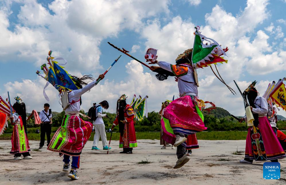 Actors stage a Dixi opera performance at the Miaoling Tunpu scenic area in Xixiu District of Anshun City, southwest China's Guizhou Province, Aug. 2, 2025. Anshun Dixi Opera is an important part of Tunpu culture dating back to the Ming Dynasty (1368-1644). The opera has been listed as a national intangible cultural heritage item in 2006. (Photo by Fan Hui/Xinhua)