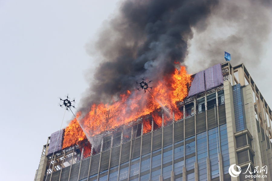 Drones take part in a fire drill at a 130-meter-tall building in the Fuzhou High-Tech Industrial Development Zone in Fuzhou, southeast China's Fujian Province. (People's Daily Online/Xie Xingyu)