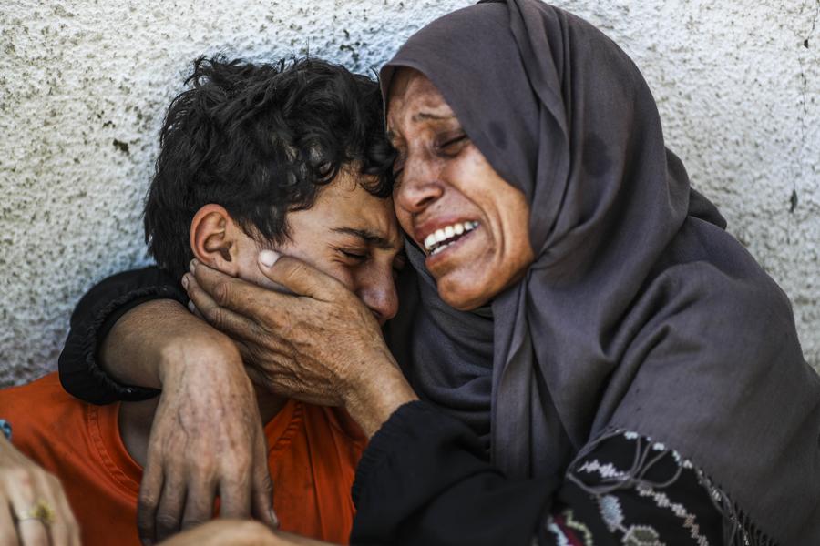 Palestinians mourn for victims at Al-Shifa Hospital in central Gaza City, on Aug. 6, 2025. (Photo by Mahmoud Zaki/Xinhua)