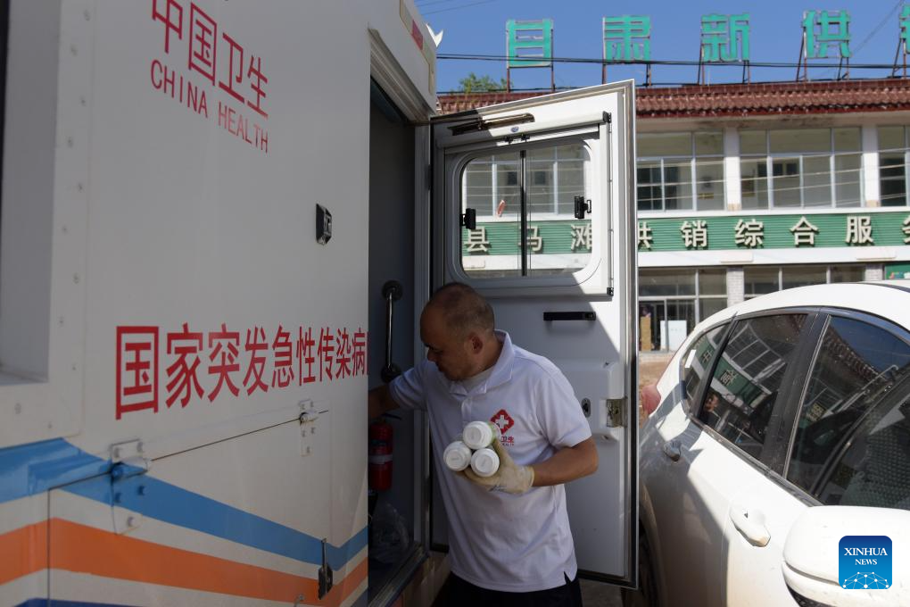 Disease control personnel and medical workers discuss environmental disinfection measures at a medical service point in Shangzhuang Village, Yuzhong County of northwest China's Gansu Province, Aug. 11, 2025. Roads damaged by mountain torrents in Yuzhong County reopened on Sunday and power supply has been restored following the disaster that left 13 dead and 30 missing. (Xinhua/Lang Bingbing)