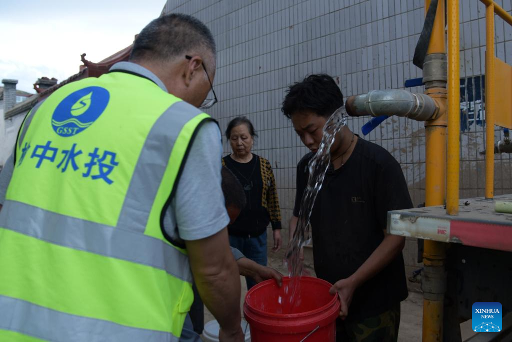 A worker of the water resources department delivers drinking water to villagers in Xinglongshan Village, Yuzhong County of northwest China's Gansu Province, Aug. 11, 2025. Roads damaged by mountain torrents in Yuzhong County reopened on Sunday and power supply has been restored following the disaster that left 13 dead and 30 missing. (Xinhua/Fan Peishen)