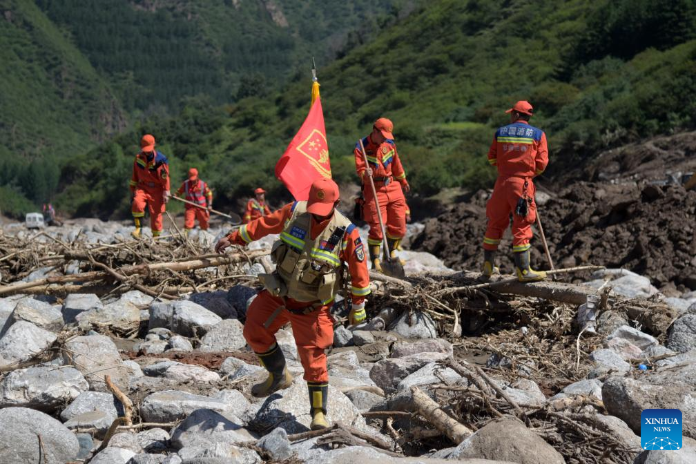 Rescuers carry out search operations in Yangwashan Village, Yuzhong County of northwest China's Gansu Province, Aug. 11, 2025. Roads damaged by mountain torrents in Yuzhong County reopened on Sunday and power supply has been restored following the disaster that left 13 dead and 30 missing. (Xinhua/Fan Peishen)