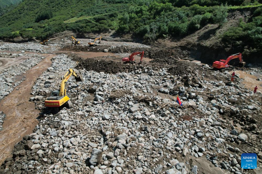 A drone photo taken on Aug. 11, 2025 shows rescuers clearing rocks following flash floods in Yangwashan Village, Yuzhong County of northwest China's Gansu Province. Roads damaged by mountain torrents in Yuzhong County reopened on Sunday and power supply has been restored following the disaster that left 13 dead and 30 missing. (Xinhua/Fan Peishen)