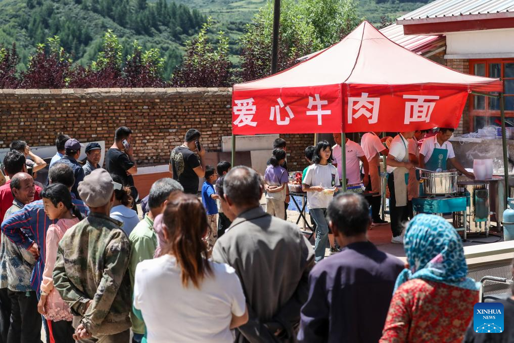 Villagers line up to receive lunch at a temporary resettlement site in Shangzhuang Village, Yuzhong County of northwest China's Gansu Province, Aug. 11, 2025. Roads damaged by mountain torrents in Yuzhong County reopened on Sunday and power supply has been restored following the disaster that left 13 dead and 30 missing. (Xinhua/Lang Bingbing)