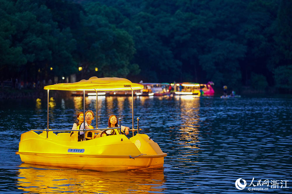 On Aug. 10, locals enjoy a nighttime boat tour in the ancient Cicheng town, Jiangbei district of Ningbo city, east China's Zhejiang Province. (People's Daily Online/Zhang Yongtao)
