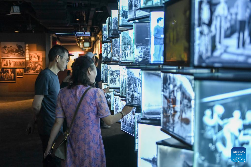 People visit a film museum built on the former site of Changchun Film Studio in Changchun, northeast China's Jilin Province, Aug. 7, 2025. Since the start of the summer vacation, the film museum has attracted visitors with film resources, with peak daily visitor numbers exceeding 8,000. (Xinhua/Yan Linyun)