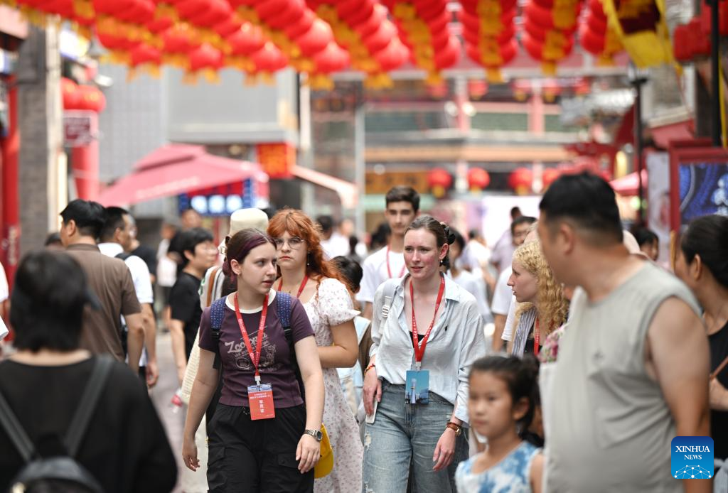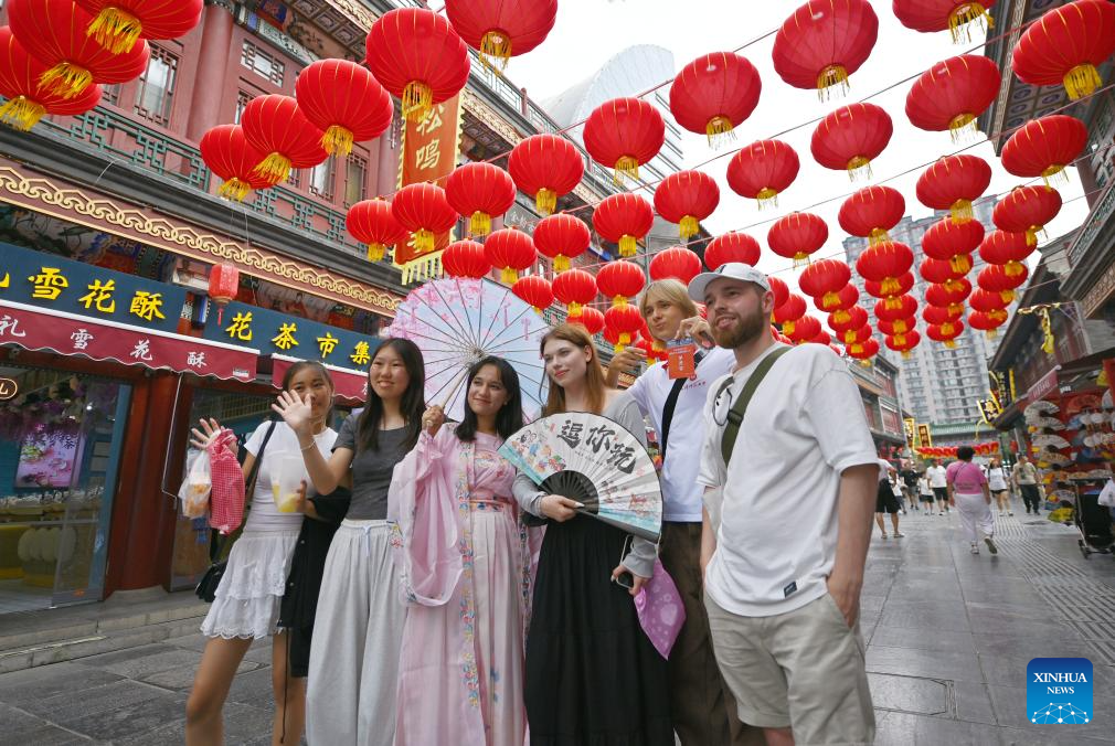 Young students from the Shanghai Cooperation Organization (SCO) countries visit an ancient cultural street in north China's Tianjin, Aug. 14, 2025. Hundreds of young students from SCO countries, who are visiting China on a cultural exchange program, experienced the charm of traditional Chinese culture here on Thursday. (Xinhua/Li Ran)