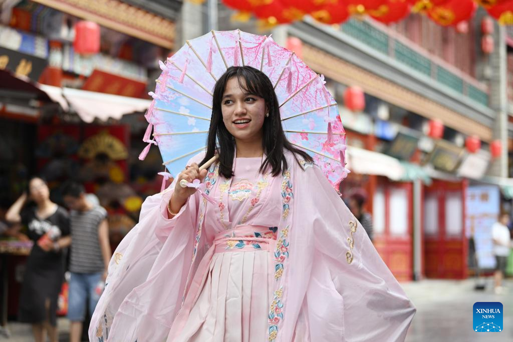 A young student from the Shanghai Cooperation Organization (SCO) country poses for a photo in traditional Chinese attire at an ancient cultural street in north China's Tianjin, Aug. 14, 2025. Hundreds of young students from SCO countries, who are visiting China on a cultural exchange program, experienced the charm of traditional Chinese culture here on Thursday. (Xinhua/Li Ran)