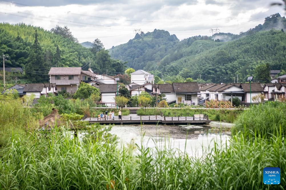 Tourists visit Lieshen Village in Zhushan Town, Liangping District of southwest China's Chongqing Municipality, Aug. 15, 2025. Lieshen Village, home to more than 8,000 mu (533 hectares) of forest, has actively transformed the obsolete mining zone there into environment-friendly businesses such as homestays, healthcare facilities and camping sites in pursuit of green development. (Xinhua/Tang Yi)