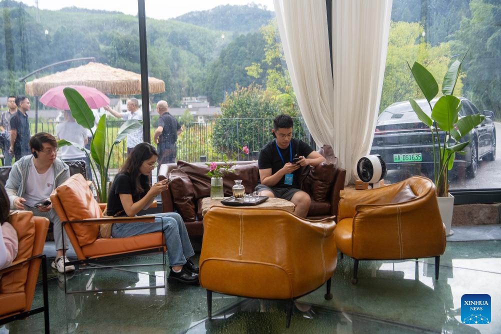People rest at a cafe converted from an obsolete mining facility at Lieshen Village in Zhushan Town, Liangping District of southwest China's Chongqing Municipality, Aug. 15, 2025. Lieshen Village, home to more than 8,000 mu (533 hectares) of forest, has actively transformed the obsolete mining zone there into environment-friendly businesses such as homestays, healthcare facilities and camping sites in pursuit of green development. (Xinhua/Tang Yi)