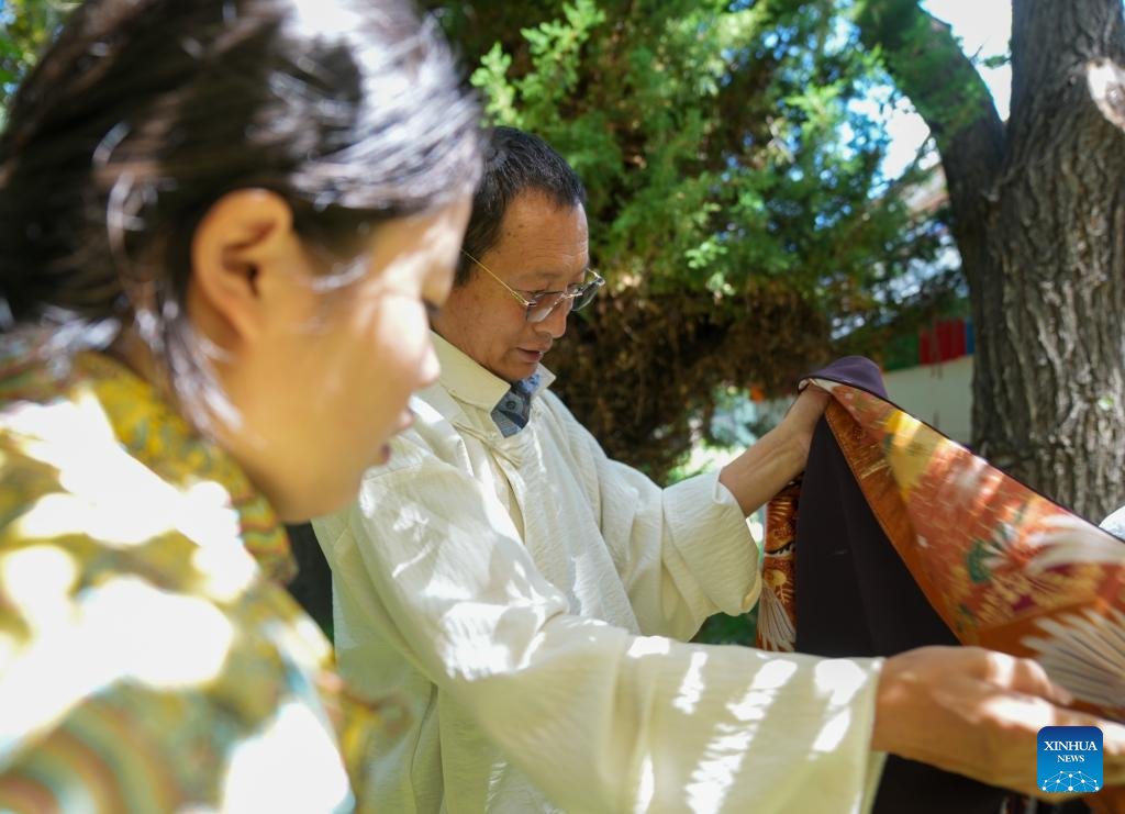 Losang Monlam (R) visits a shop of his graduated apprentice in Lhasa, southwest China's Xizang Autonomous Region, Aug. 15, 2025. Traditional Tibetan costumes, after centuries of evolution and development, have formed rich styles and unique features. (Xinhua/Jigme Dorje)
