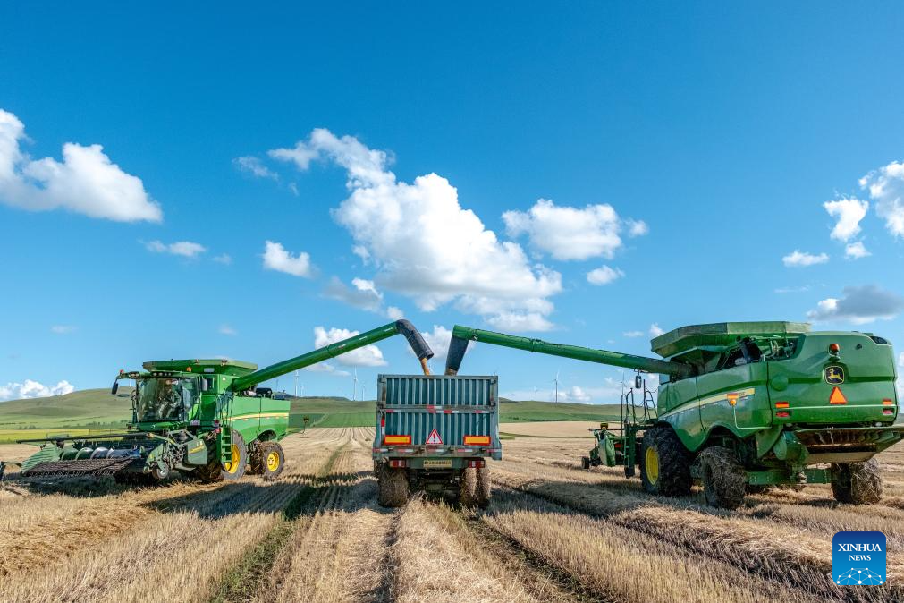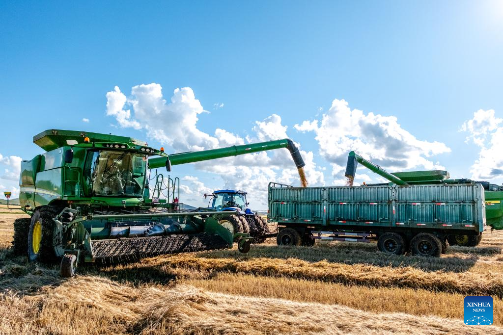 Farmers drive harvesters to load newly-harvested wheat onto a truck at a farm in Ergun of Hulun Buir, north China's Inner Mongolia Autonomous Region, Aug. 20, 2025. Wheat here has entered harvest season recently. (Xinhua/Ma Jinrui)