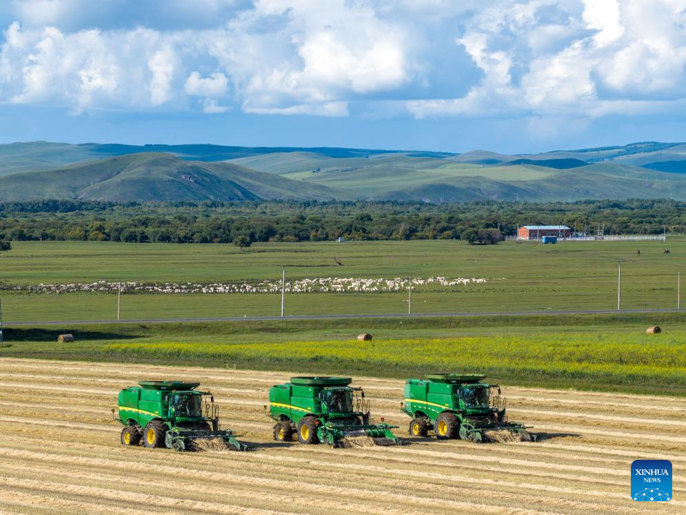 An aerial drone photo taken on Aug. 20 shows harvesters harvesting wheat at a farm in Ergun of Hulun Buir, north China's Inner Mongolia Autonomous Region. Wheat here has entered harvest season recently. (Xinhua/Ma Jinrui)