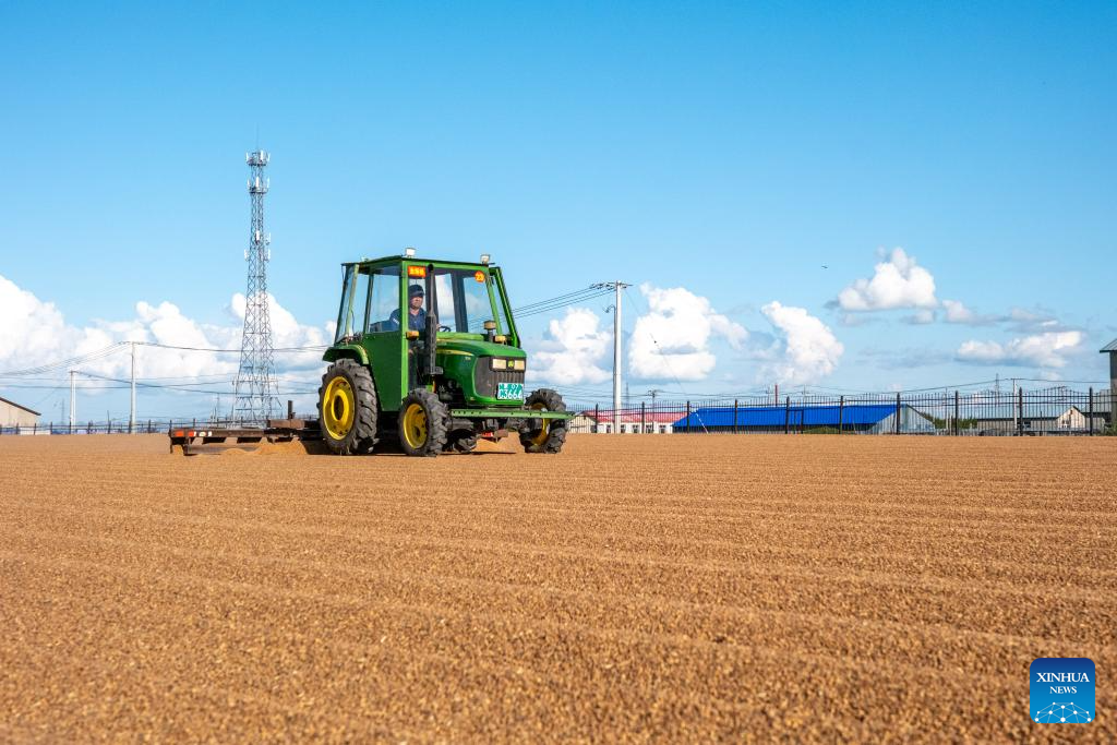 A farmer drives a tractor to dry wheat at a farm in Ergun of Hulun Buir, north China's Inner Mongolia Autonomous Region, Aug. 20, 2025. Wheat here has entered harvest season recently. (Xinhua/Ma Jinrui)