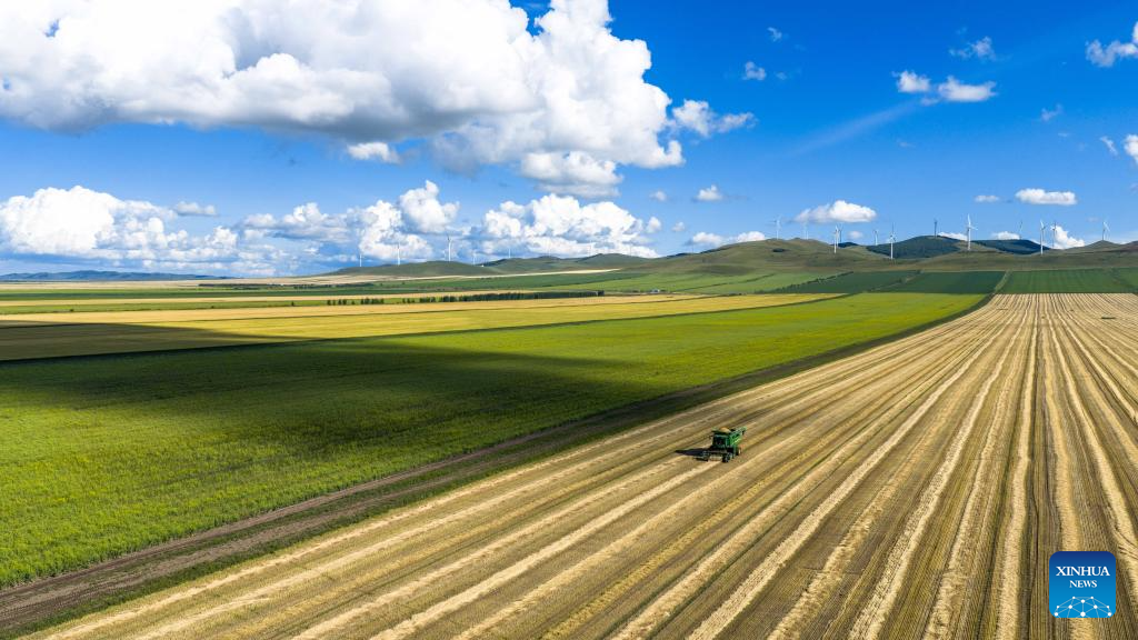 An aerial drone photo taken on Aug. 20 shows a harvester harvesting wheat at a farm in Ergun of Hulun Buir, north China's Inner Mongolia Autonomous Region. Wheat here has entered harvest season recently. (Xinhua/Ma Jinrui)