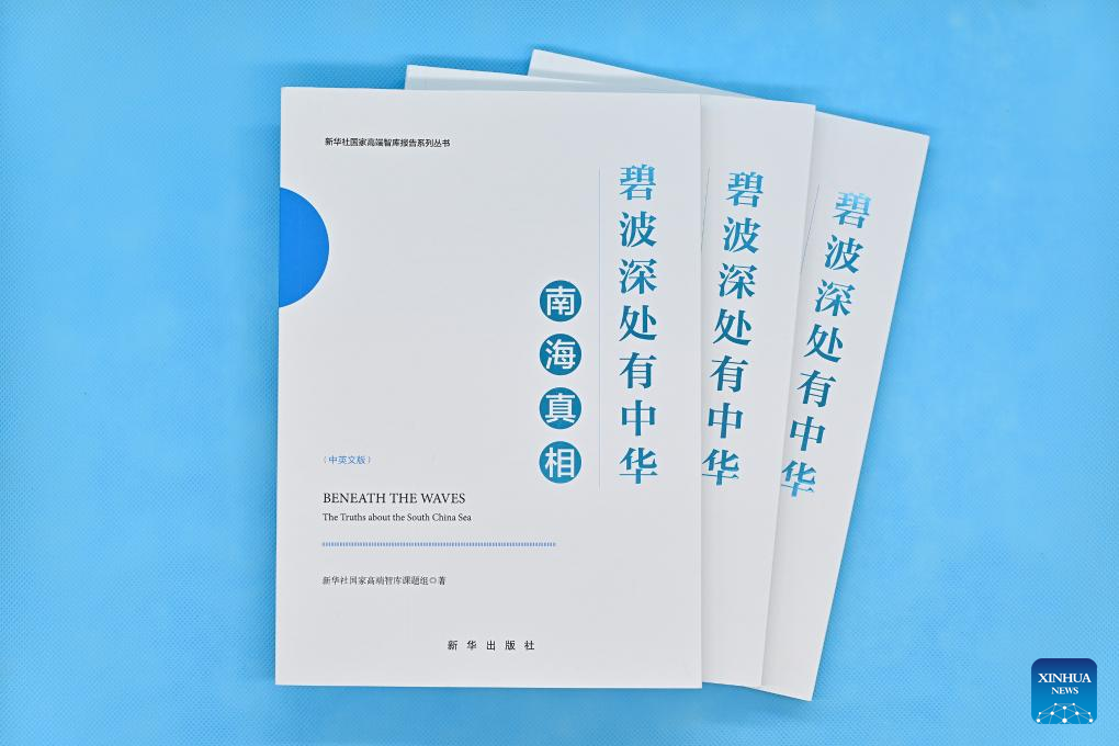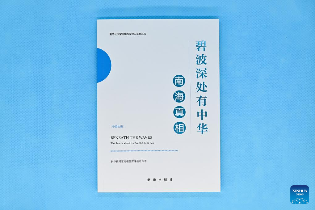 This photo shows copies of the report titled "The Truths about the South China Sea" published in both Chinese and English by Xinhua Institute, a think tank affiliated with Xinhua News Agency. (Xinhua/Li Xin)