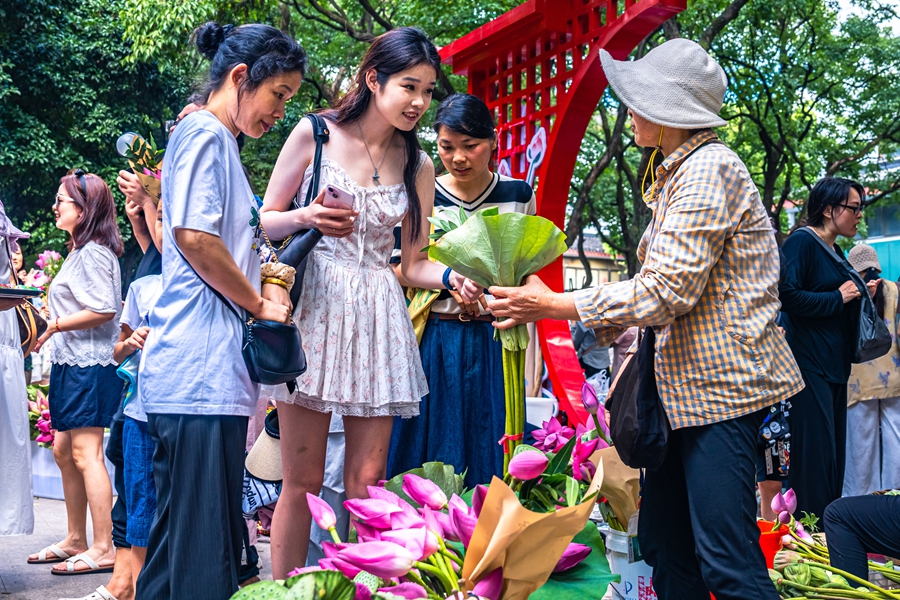 People purchase lotus flowers at a market on Baita West Road in Gusu district, Suzhou, east China's Jiangsu Province, Aug. 14, 2025. (Photo/Zhang Feng)