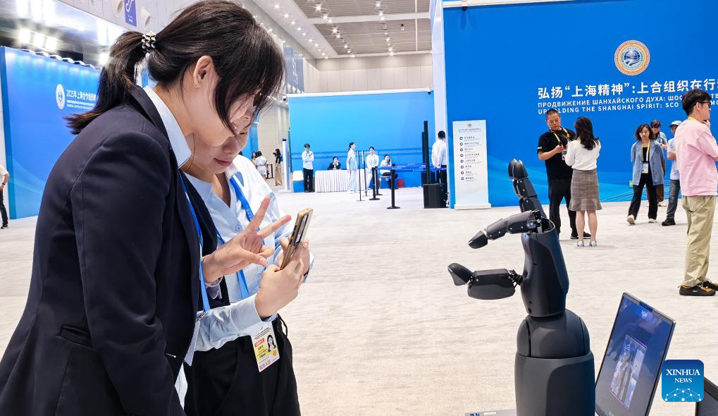 People interacts with a robotic hand capable of high dexterity and fine tactile sense at the media center for the Shanghai Cooperation Organization (SCO) Summit 2025 in north China's Tianjin, on Aug. 30, 2025. A variety of robots have attracted numerous eyes at the media center as the SCO Summit 2025 is held in this port city from Aug. 31 to Sept. 1. (Xinhua/Wang Jianhua)