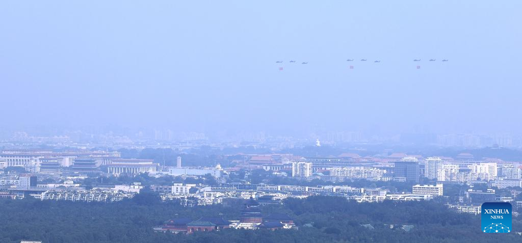The flag-guarding air echelon flies over Tian'anmen Square during a grand gathering to commemorate the 80th anniversary of the victory in the Chinese People's War of Resistance against Japanese Aggression and the World Anti-Fascist War in Beijing, capital of China, Sept. 3, 2025. (Xinhua/Yang Guanyu)