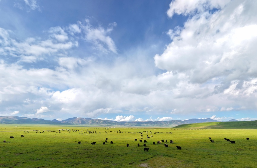 Photo shows the fertile pastures at the foot of the Qilian Mountains in Qilian county, northwest China's Qinghai Province. (Photo/Rinchen Dorje)