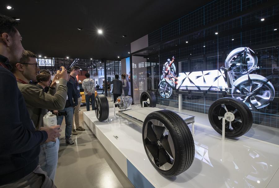 People visit the exhibition zone of Volkswagen during the 2025 IAA Mobility in Munich, Germany, Sept. 9, 2025. (Xinhua/Zhang Fan)