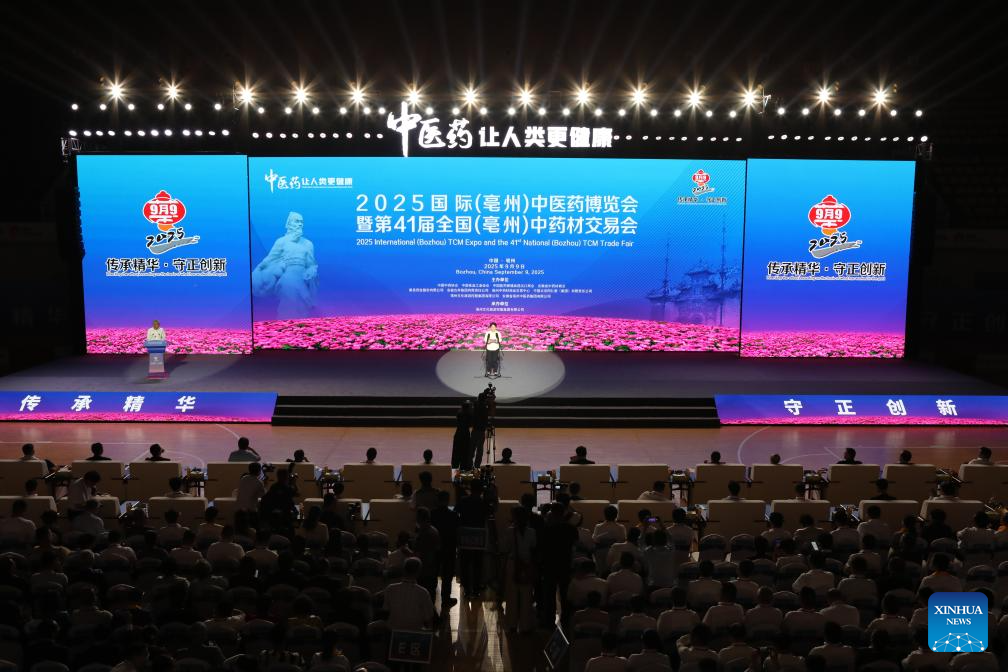 This photo taken on Sept. 9, 2025 shows the site of 2025 International (Bozhou) TCM (traditional Chinese medicine) Expo and the 41st National (Bozhou) TCM Trade Fair in Bozhou, east China's Anhui Province. The expo has attracted many international traders, presenting opportunities to further boost the global reach of TCM. (Xinhua)