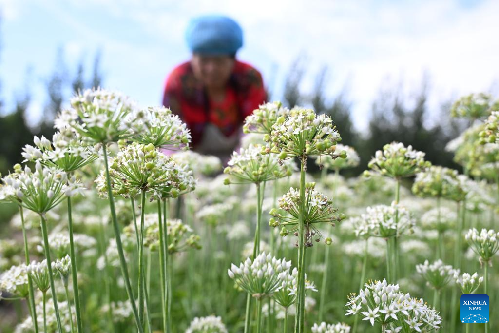 A villager harvests Chinese chive flowers in Lingshan Street of Jimo District in Qingdao City, east China's Shandong Province, Sept. 11, 2025. (Photo by Zhang Tao/Xinhua)