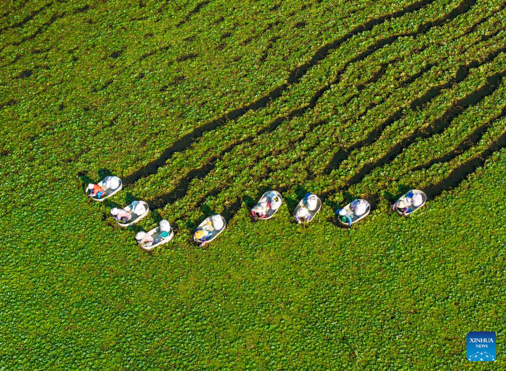 An aerial drone photo shows villagers picking water chestnuts in Suchen Town of Hailing District in Taizhou City, east China's Jiangsu Province, Sept. 10, 2025. (Photo by Zhou Shegen/Xinhua)