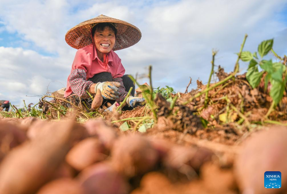 A farmer harvests sweet potatoes in Xianglinpu Town of Daoxian County in Yongzhou City, central China's Hunan Province, Sept. 11, 2025. (Photo by Jiang Keqing/Xinhua)