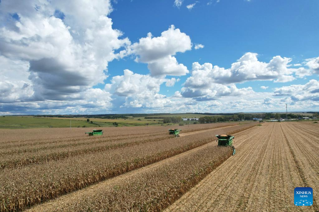 A drone photo shows harvesters working in a farm under Beidahuang Group in northeast China's Heilongjiang Province, Sept. 10, 2025. (Photo by Xu Yingxian/Xinhua)