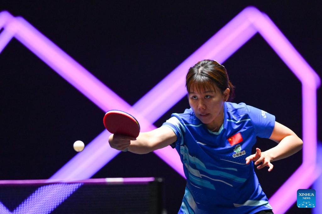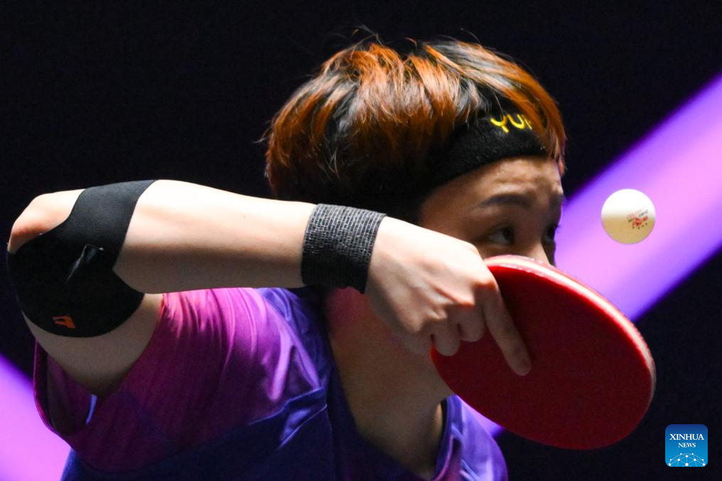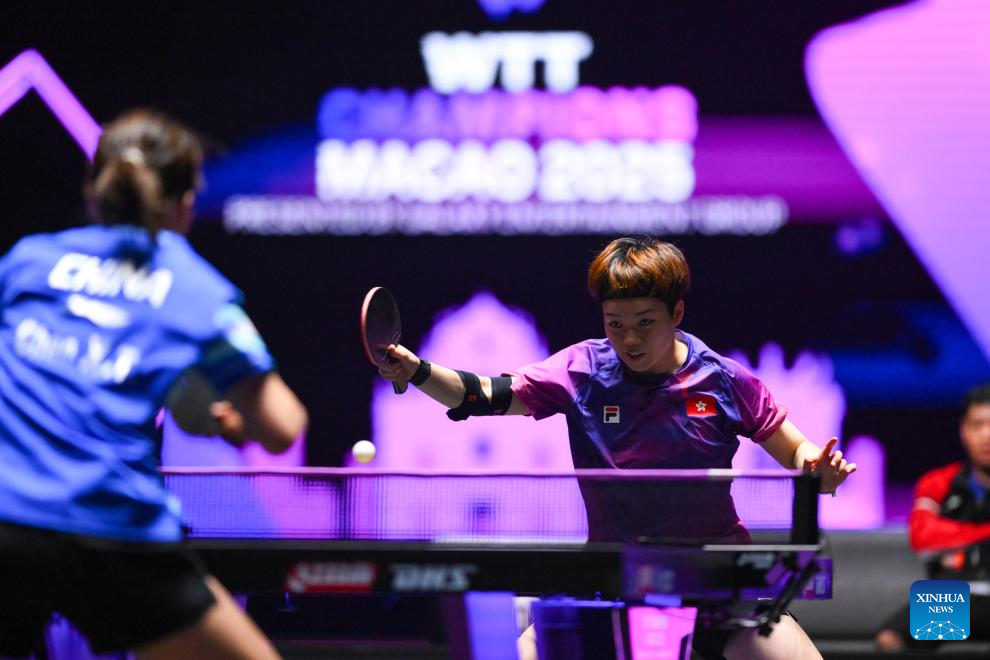 Doo Hoi Kem of China's Hong Kong hits a return during the women's singles round of 16 match against Chen Xingtong of China at the 2025 World Table Tennis (WTT) Champions Macao in Macao, south China, Sept. 12, 2025. (Xinhua/Cheong Kam Ka)