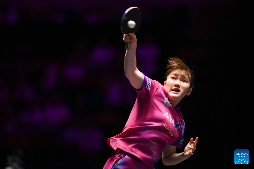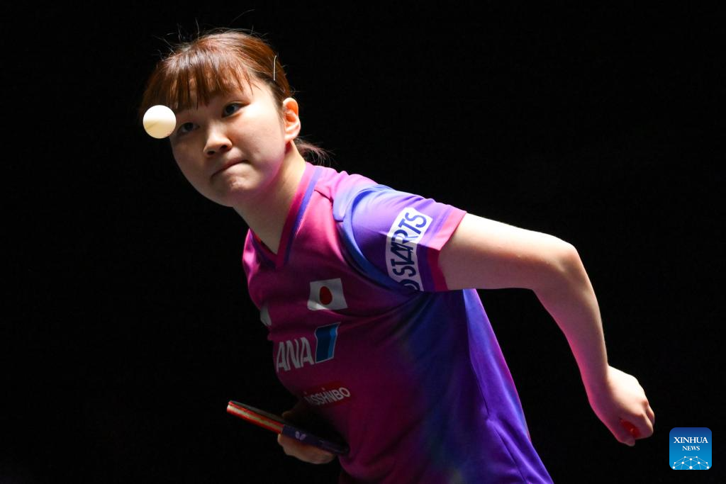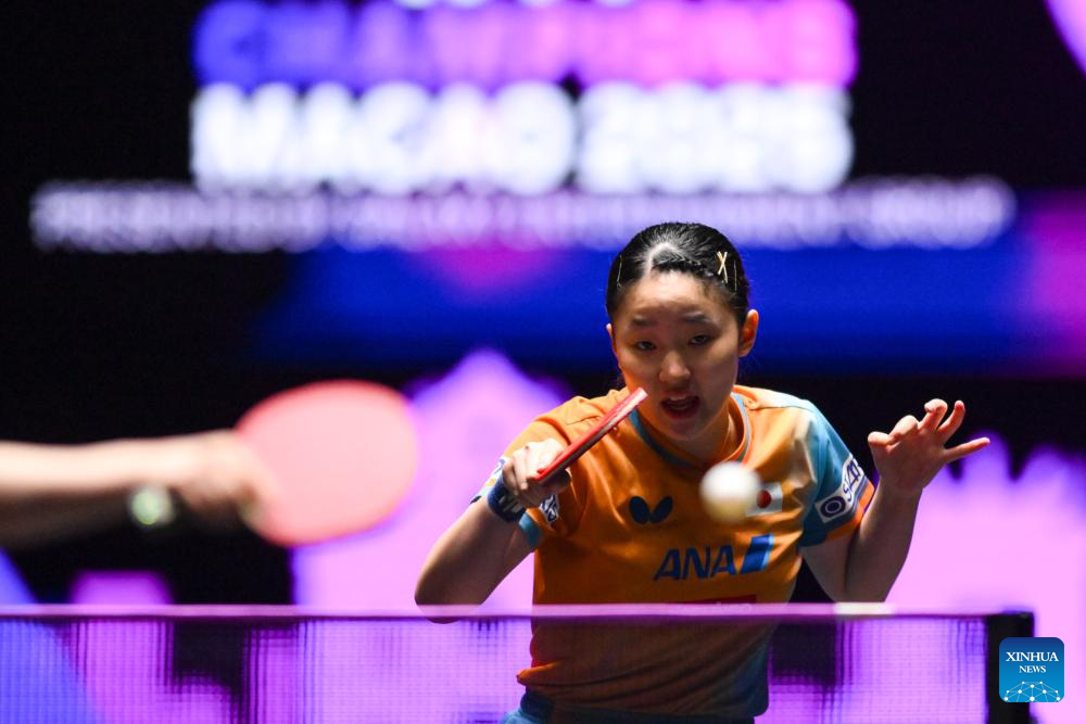 Harimoto Miwa of Japan hits a return during the women's singles round of 16 match against Odo Satsuki of Japan at the 2025 World Table Tennis (WTT) Champions Macao in Macao, south China, Sept. 12, 2025. (Xinhua/Cheong Kam Ka)