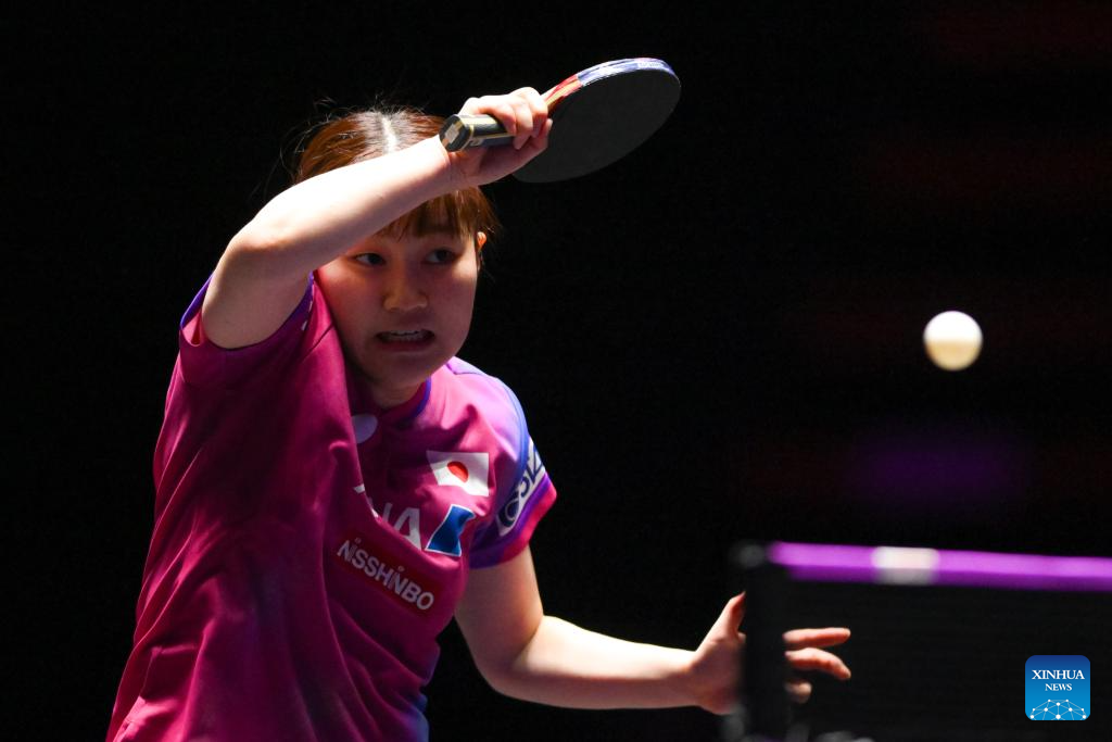 Odo Satsuki of Japan hits a return during the women's singles round of 16 match against Harimoto Miwa of Japan at the 2025 World Table Tennis (WTT) Champions Macao in Macao, south China, Sept. 12, 2025. (Xinhua/Cheong Kam Ka)
