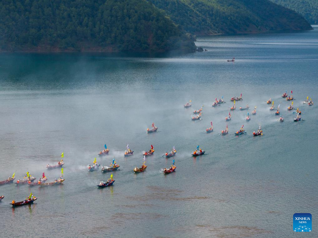 An aerial drone photo taken on Sept. 16, 2025 shows local people circling the lake by boat in Yanyuan County of Liangshan Yi Autonomous Prefecture, southwest China's Sichuan Province. The first mountain and lake circling festival of Lugu Lake kicked off at Liangshan Yi Autonomous Prefecture on Tuesday. Mountain and lake circling is an important folk custom of the Mosuo people living near Lugu Lake. Starting this year, Liangshan Prefecture has officially designated the 25th day of the seventh lunar month as the mountain and lake circling festival, making it a local statutory holiday. Residents of Yanyuan and Muli counties can enjoy a one-day exclusive holiday. (Xinhua/Jiang Hongjing)