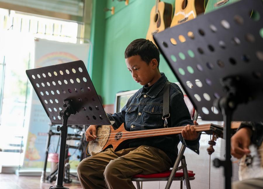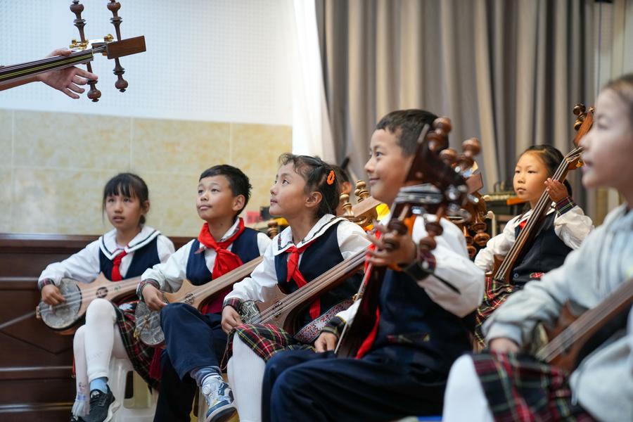 Students play Zhanian, a traditional Tibetan stringed instrument, at Lhasa Experimental Primary School in Lhasa, southwest China's Xizang Autonomous Region, Sept. 11, 2025. (Xinhua/Jigme Dorje)