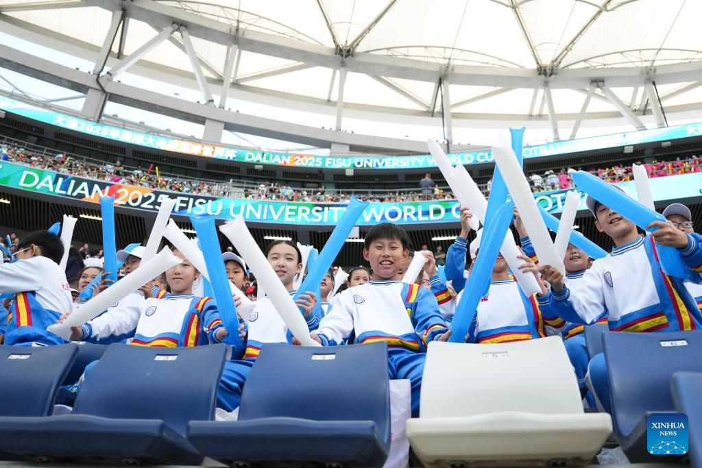 Spectators cheer during the opening ceremony of the 2025 FISU University World Cup Football held in Suoyuwan Stadium in Dalian, northeast China's Liaoning Province, Sept. 17, 2025. (Xinhua/Zheng Huansong)
