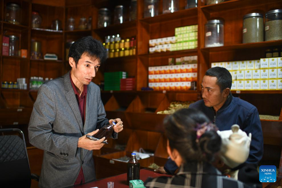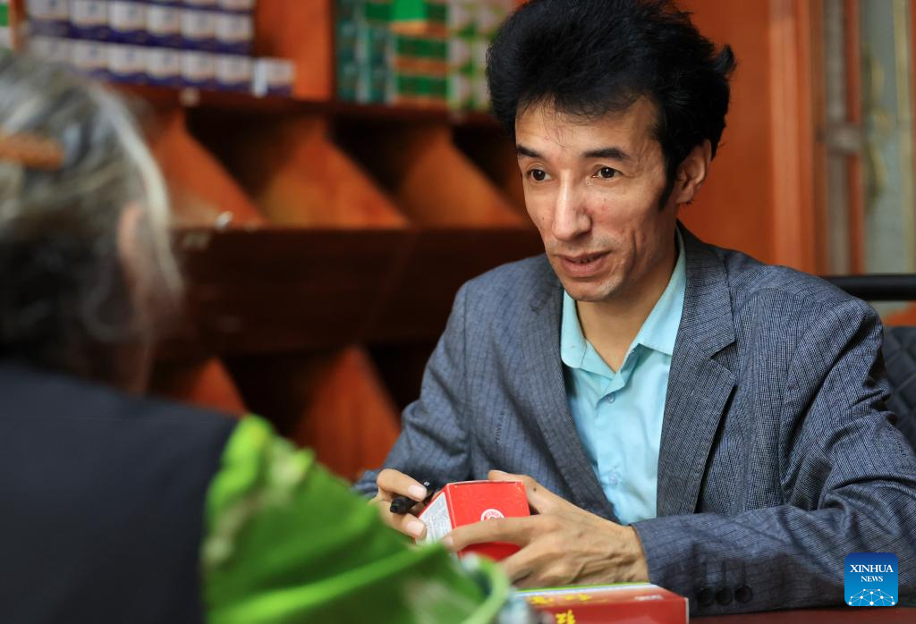 Metkasim Manglik receives customers at his herbal tea shop in Qira County, northwest China's Xinjiang Uygur Autonomous Region, Sept. 6, 2025. (Xinhua/Wang Fei)