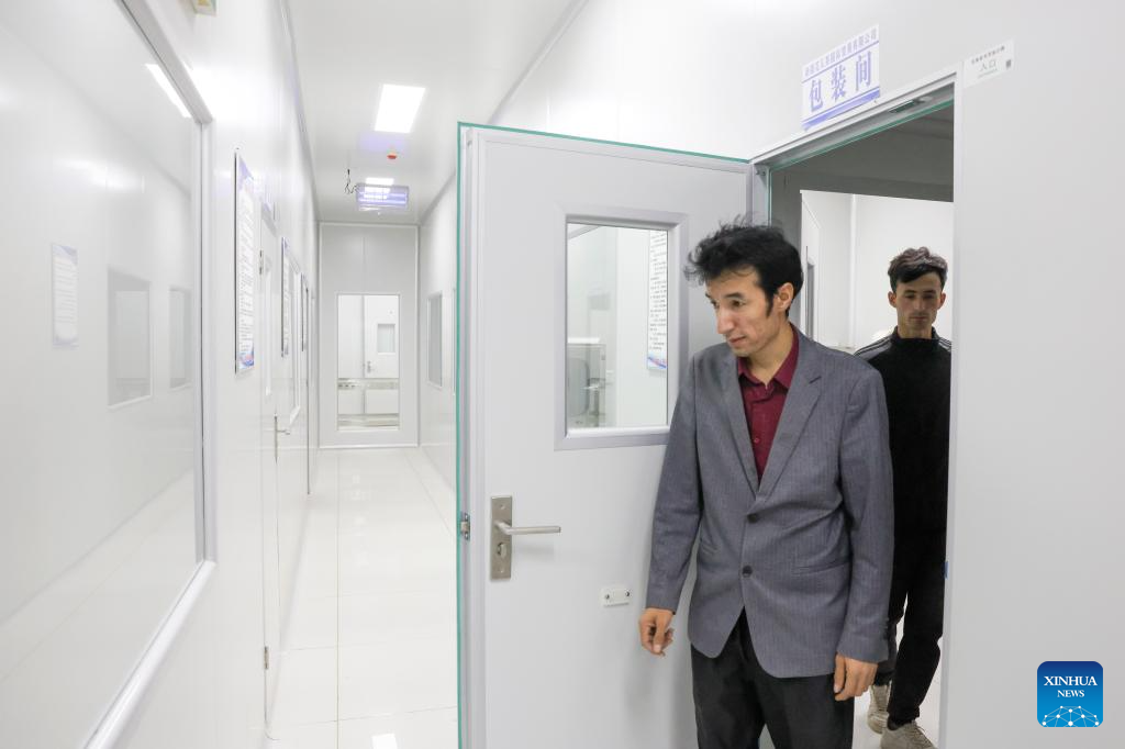 Metkasim Manglik (L) and his nephew check the equipment at a workshop of their factory which will soon be operational in Qira County, northwest China's Xinjiang Uygur Autonomous Region, Sept. 6, 2025. (Xinhua/Wang Fei)
